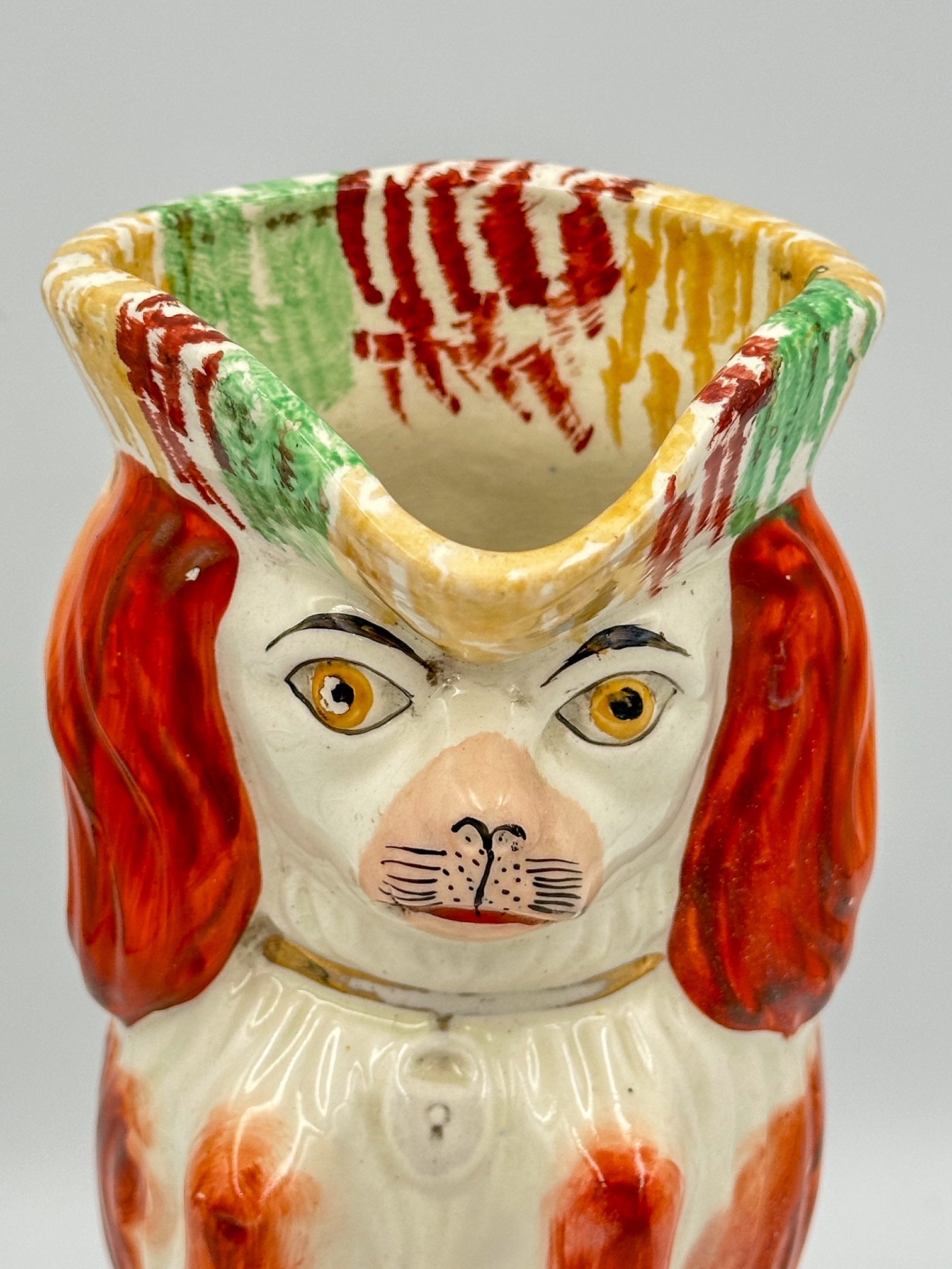 Charming antique 1860s Staffordshire Dog pitcher in begging pose. This beautiful example of English antique craftsmanship brings character and joy to any space. Imported from England